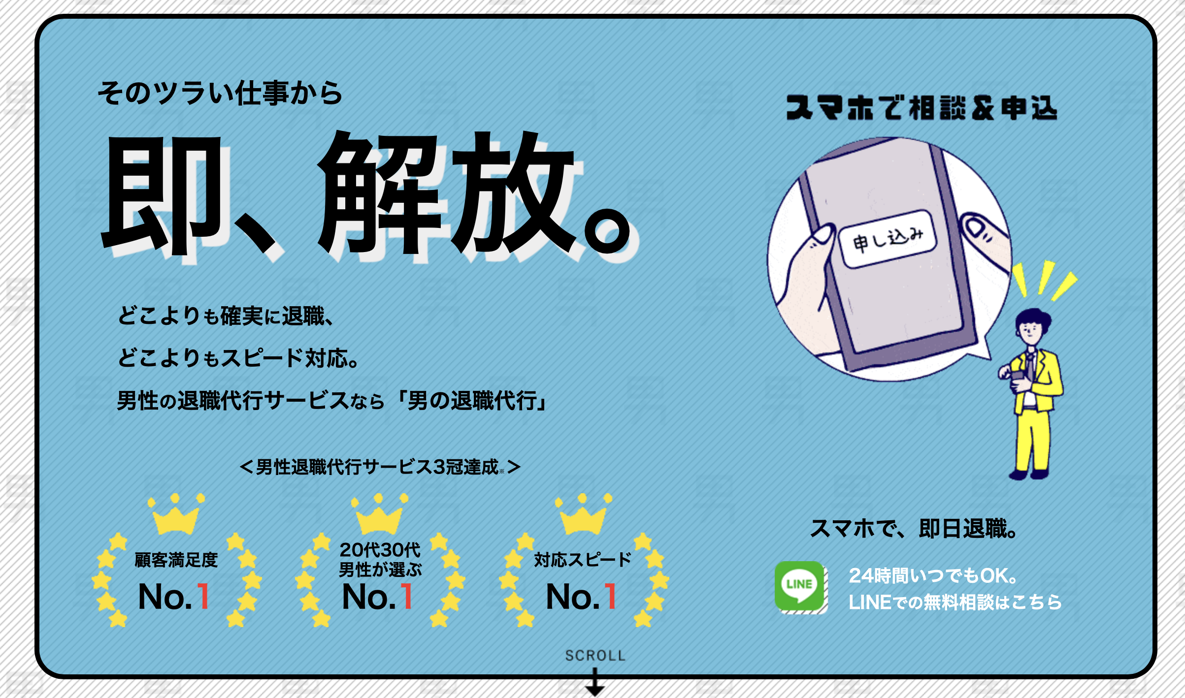 「男の退職代行」は、男性の退職代行に特化することで、男性のみを専門に扱うことで、特有の悩みに考慮し、辞めたいけど退職を言い出せずに苦しむ男性を退職ストレスから解放、「今よりも良い条件の仕事へ」行けるようサポートすることを最大の目的としたサービスです。